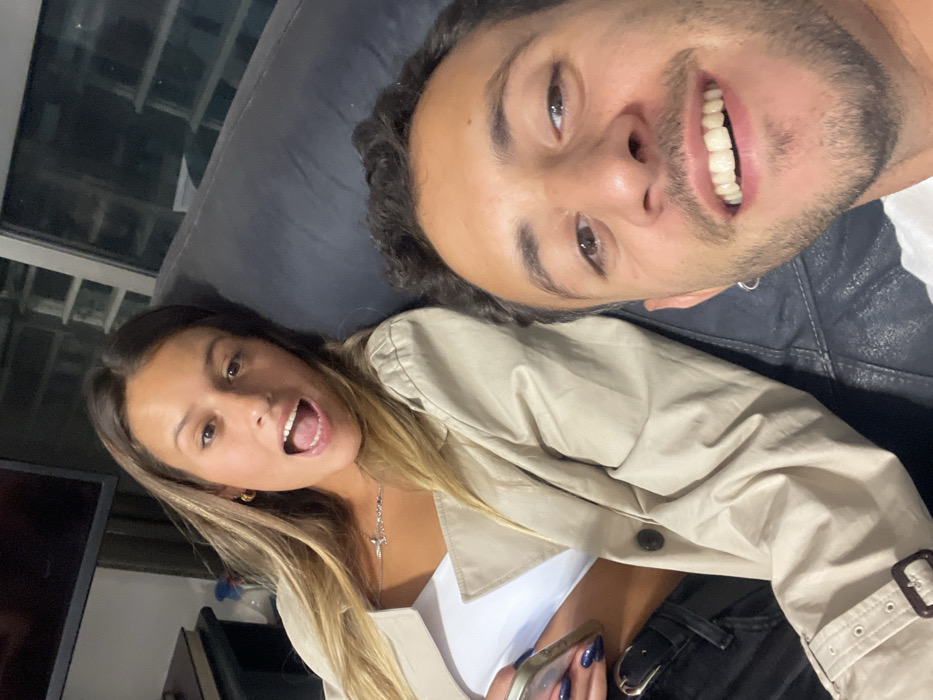 An indoor photograph, likely a selfie, depicts a young adult male and a young adult female seated on a dark couch