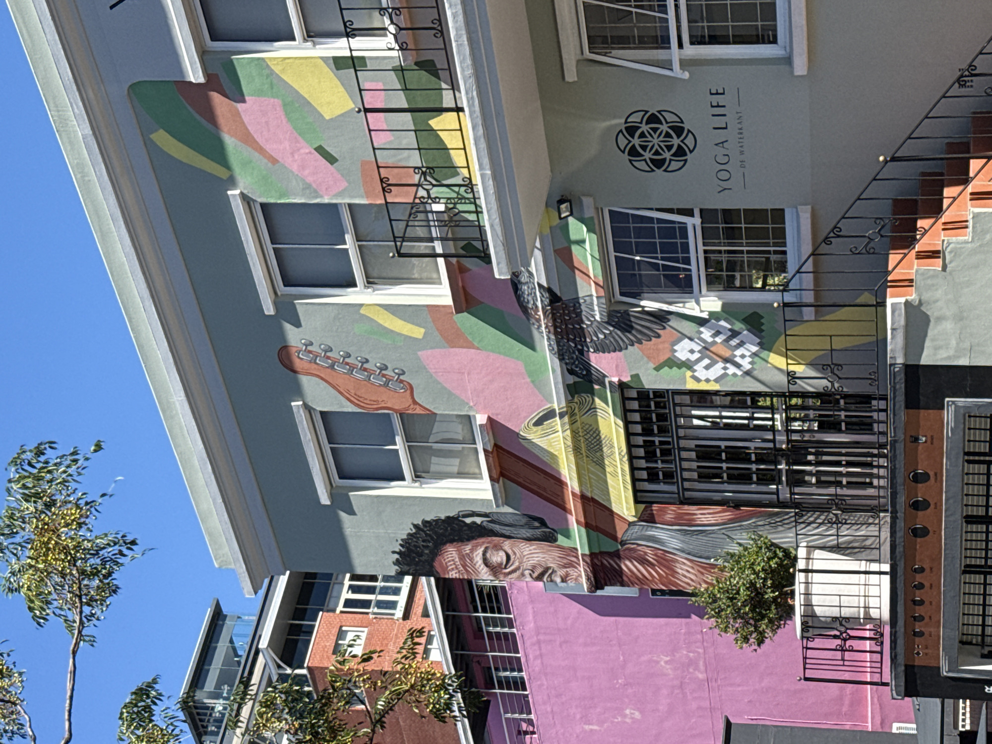 The image displays a daytime urban scene in the De Waterkant neighborhood of Cape Town, South Africa. The central feature is a multi-story building with a light green-grey facade covered by a large, colorful mural. The mural includes the profile of a man with closed eyes wearing headphones, an orange guitar neck, a yellow brass instrument, a bird with outstretched wings, and abstract geometric shapes in pink, green, yellow, and brown. White-framed windows are visible across the building's front, with a black wrought-iron balcony extending from the upper level. A sign reading "YOGA LIFE - DE WATERKANT" with a circular geometric logo is affixed to the lower right facade. Terracotta-colored steps with a black wrought-iron handrail lead to a ground-level entrance. A white planter holding a small green tree is situated on a lower-level balcony with a similar black railing. To the left, an adjacent building with a vibrant magenta wall is visible, behind which stand reddish-brown brick buildings and a modern glass structure. Green tree branches partially obscure the bright blue sky in the upper left. No people are actively present in the scene.