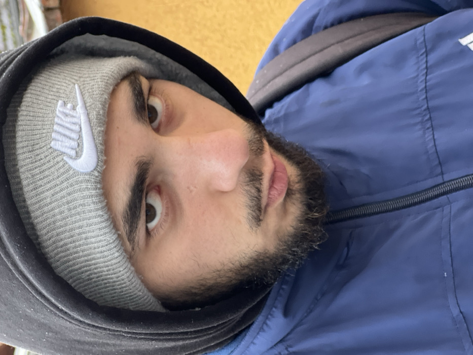 A close-up, eye-level portrait captures a male individual with dark eyes, dark hair, a beard, and a mustache, looking directly forward. He is wearing a grey ribbed knit beanie with a white embroidered "NIKE" logo prominently displayed on the front. A dark-colored hooded sweatshirt is worn with the hood pulled over the beanie. Beneath this, a blue athletic-style jacket with a dark central zipper is visible. A dark backpack strap is seen over his right shoulder. The background is out of focus, revealing a light, indistinct surface to the left and a vivid yellow or ochre wall to the right. This scene is situated in Meistratzheim, France.