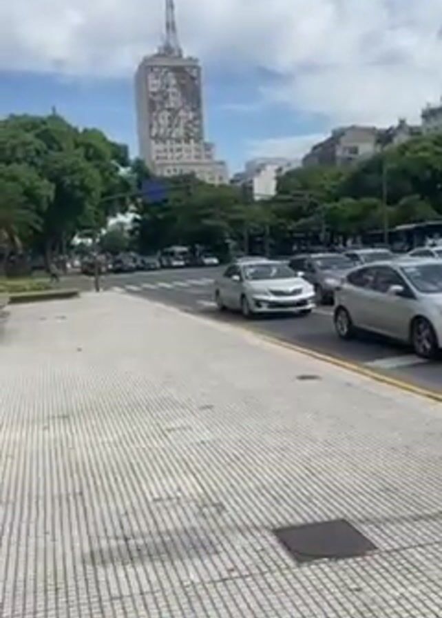 The video depicts a city street scene with moderate traffic under a partly cloudy sky. The camera is positioned on a sidewalk paved with small, light-colored tiles with a visible manhole cover. Cars, mostly silver or gray sedans, are moving along the road, interspersed with buses. Tall green trees line the road, providing some shade. In the background, a notable skyscraper with a slender spire and a mural-like image covering one side is visible. Towards the end of the video, a man in a blue shirt walks into the frame from the right.