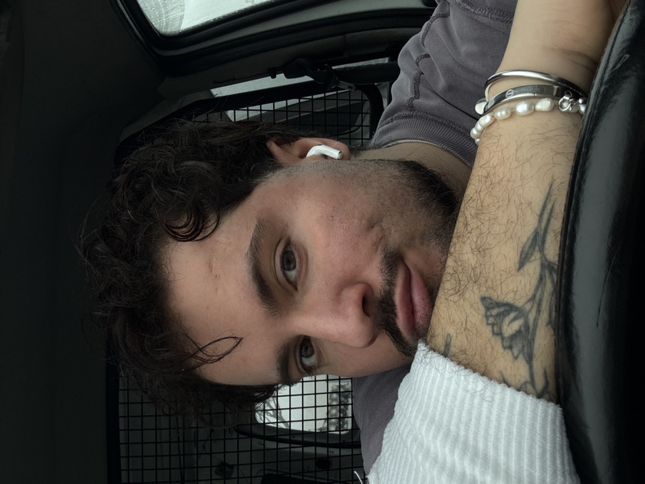 A male individual is depicted in a close-up self-portrait taken inside a vehicle, likely a van, within the city of Vila Nova de Gaia, Portugal. The subject, positioned centrally, has dark, curly hair, light brown eyes, a mustache, and a beard. He wears a grey short-sleeved top and a white wireless earbud in his right ear. His head is slightly tilted, and his lips are subtly pursed as he looks directly into the camera. His right forearm, bearing a black-ink floral tattoo, rests on a dark, presumably flat surface like a steering wheel or dashboard. His right wrist is adorned with a white pearl bracelet and at least two silver-toned bangles. His left arm is partially visible, resting on a white, textured fabric or towel. The background, visible through the vehicle's windows, shows a metal grid partition and an overcast outdoor environment.