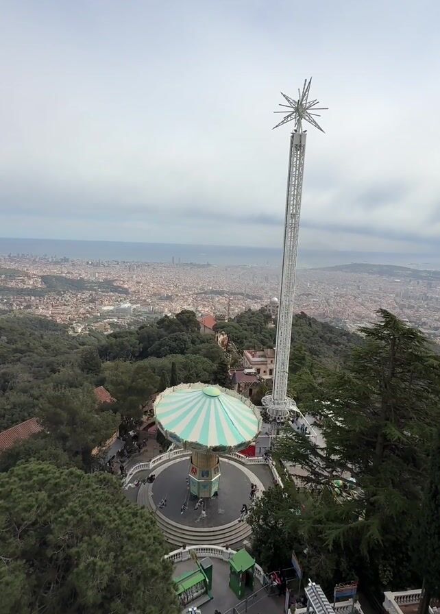 The video presents a high-angle, wide shot of an amusement park on a mountain overlooking a sprawling city by the sea, taken during an overcast day. Prominently featured are two rides: a classic carousel with a green and white striped canopy, and a tall, white vertical tower ride topped with a star-shaped structure. People are seen around and on the carousel. The city, which could be Barcelona, extends towards the horizon where the sea meets the sky, blurred by clouds. The foreground is composed of dense green trees surrounding the amusement park. The viewpoint seems to be from a structure within the park itself.