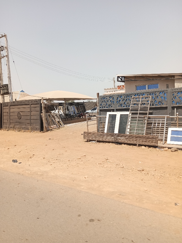 This image depicts an outdoor scene in the city of Kwang, Nigeria, characterized by a dry, dusty environment under a clear sky. In the foreground, a sandy-colored dirt path occupies the majority of the lower frame, with a sliver of dark asphalt road visible at the very bottom. To the left, a tall wooden utility pole with multiple cross arms supports power lines extending horizontally across the midground. Adjacent to the pole is a dark brown, solid metal gate with a circular design embossed near its center, marking the entrance to a property. Behind this gate, a light-colored, possibly beige, tensile fabric canopy provides shade over an area where several vehicles, including a white car and a motorcycle, are visible. To the right, another property features a modern, decorative metal gate with intricate geometric cutouts, backed by blue panels. In front of this gate, on the dirt path, various construction materials are displayed. These include several white-framed glass doors or large windows, multiple metal window grilles or frames, and a stack of horizontal planks, likely wood or metal, arranged on low supports. In the background, above the right gate, a two-story building with a light-colored facade is visible, featuring blue-tinted windows on its upper level. No individuals or active interactions are discernible within the frame. The overall impression is that of a commercial area or workshop displaying building materials.