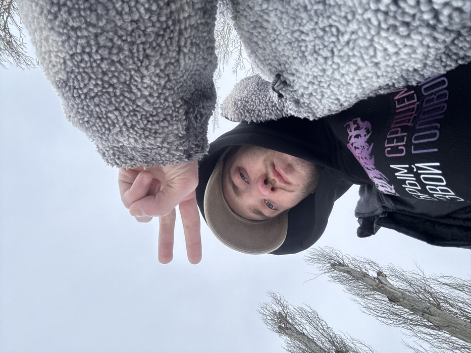 A male individual is depicted in a low-angle, close-up outdoor photograph taken in Tolyatti, Russia, under an overcast sky. The subject, a young adult with light facial hair and blue eyes, wears a black hooded sweatshirt with a purple graphic and Cyrillic text, partially obscured by his chin. Over the sweatshirt, he wears a light gray, textured fleece jacket. A beige baseball cap is visible beneath the hood. His right hand is raised, performing a "peace" sign with the index and middle fingers extended. The background consists of a uniformly light gray sky, with the bare, leafless upper branches of several tall trees visible on the left and right sides, indicating a cold weather season. The subject is looking directly into the camera with a neutral expression.