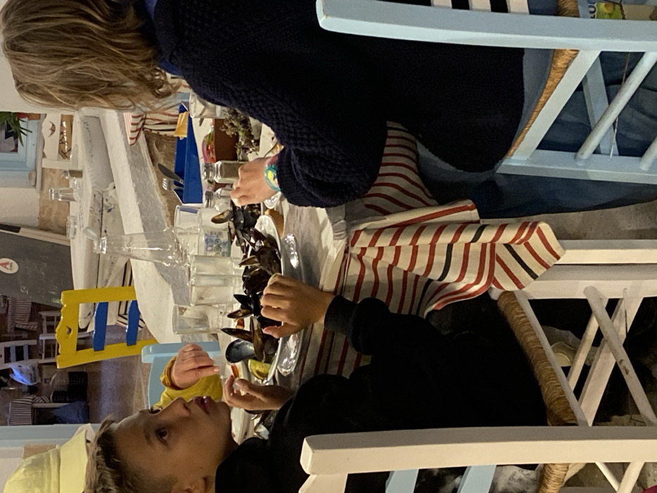 The image portrays an indoor dining scene at a restaurant in Megalochori, Greece. A young male with short brown hair, wearing a black hooded top, is seated on the left side of a table, looking towards the left. His hands are positioned near a white platter laden with cooked mussels and lemon wedges, which occupies the center of the table. A second individual, with long, wavy blonde hair, dressed in a dark blue knitted top and blue jeans, is seated opposite the first, with their back to the camera; a colorful bracelet is visible on their right wrist. A third person's hand, wearing a yellow sleeve, is partially visible behind the young male. The table is covered with a white tablecloth, overlaid with a decorative red, white, and black striped fabric. Other items on the table include multiple clear glass pitchers, smaller drinking glasses, salt and pepper shakers, a blue holder containing utensils, and a small dish containing what appears to be grapes. The chairs are wooden with woven straw seats, in white and light blue colors. In the blurred background, the restaurant's interior features white walls, arched architectural elements, additional tables and chairs, a yellow and blue chair, and a dark board displaying a white 'A' logo.