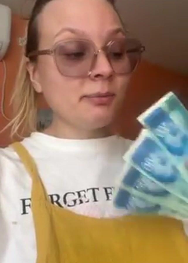 woman holding up a stack of banknotes