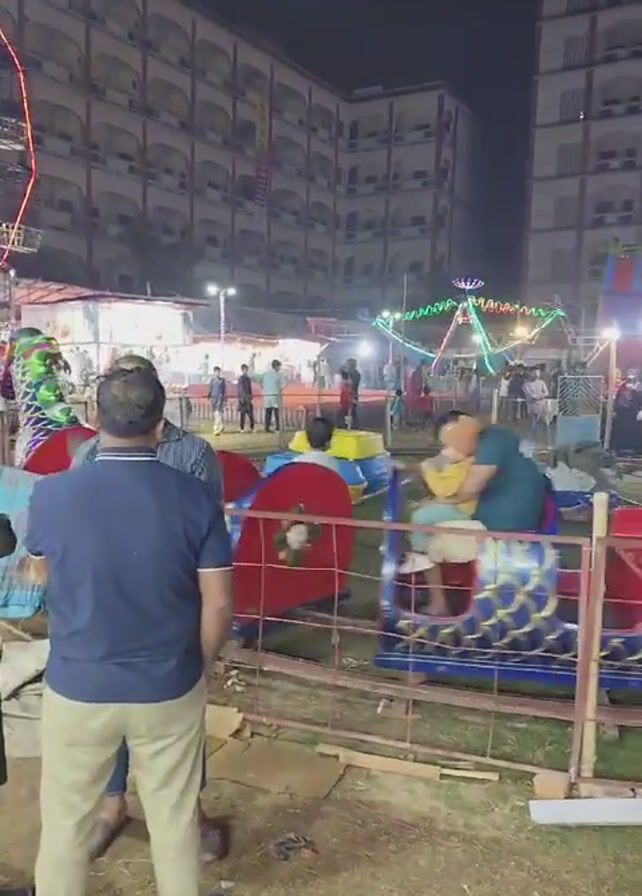 The scene is captured at an outdoor nighttime fair, likely an amusement park or carnival, with several rides and food vendors set up. Two large, multi-story buildings serve as a backdrop. The foreground is focused on a ride that appears to be a small, enclosed dragon train, painted in blues, reds, and greens, designed for children. The ride is bordered by a metal fence. People are moving around in the background. Illuminated rides and attractions include a swing carousel, a star-shaped light display, and a bouncy castle. A food stall advertising “Smoke Biscuit” is also visible. The ground is a mix of grass and exposed construction materials. An elderly man with a white hat passes in front of the camera briefly. The camera remains relatively stable, providing a wide view of the scene.