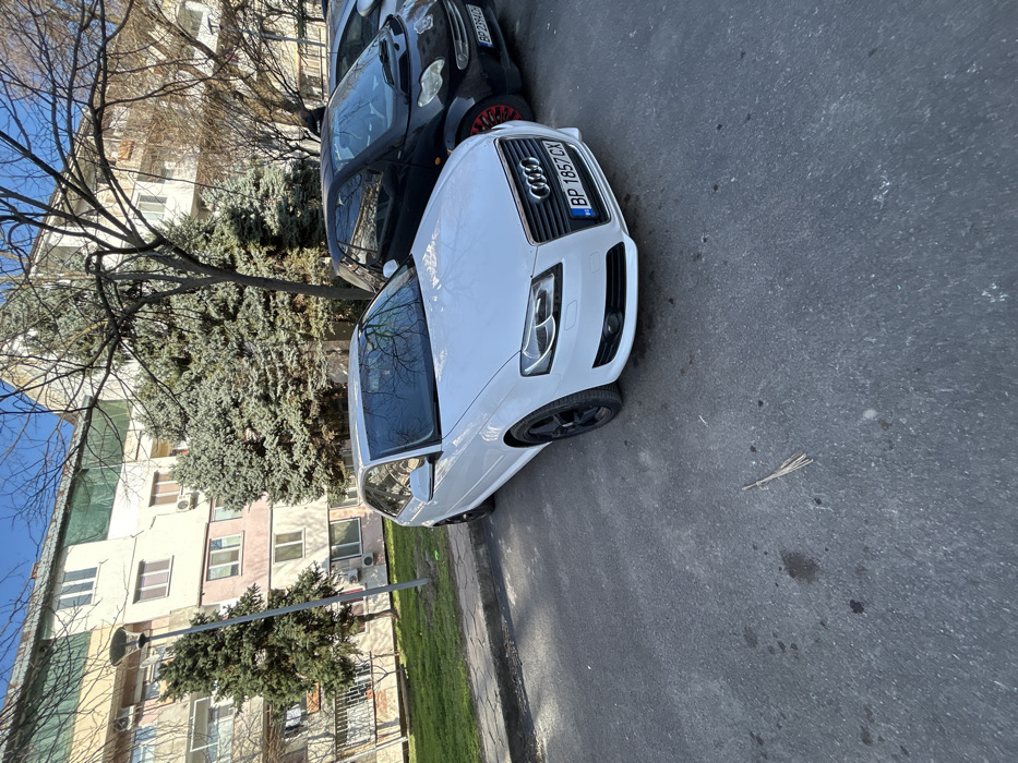 The scene depicts a daytime outdoor environment in Kozloduy, Bulgaria, specifically a paved parking area adjacent to multi-story residential buildings. A white Audi A3 hatchback, equipped with black multi-spoke wheels and bearing Bulgarian license plate "BP 1857 CX," is parked prominently in the foreground, angled slightly towards the right. To its right and slightly behind it, a black Smart ForTwo coupe with red wheel accents and Bulgarian license plate "BP 2394 CH" is parked. A third, lighter-colored vehicle is partially visible behind the Smart. The asphalt ground exhibits minor stains and a small bundle of dry, straw-like material is present in the lower center. In the background, multiple apartment buildings, characterized by light-colored facades (predominantly beige, cream, and pale pink sections), numerous windows, and some balconies, line the area. Several external air conditioning units are affixed to the building walls. A metal street lamp post stands to the left. The environment includes mature trees, some bare-branched deciduous specimens, and several tall, dense evergreen conifers. Patches of green grass are visible between the pavement and the buildings. The sky is clear and blue, indicating bright, direct sunlight that casts distinct shadows. No individuals are visible in the frame.