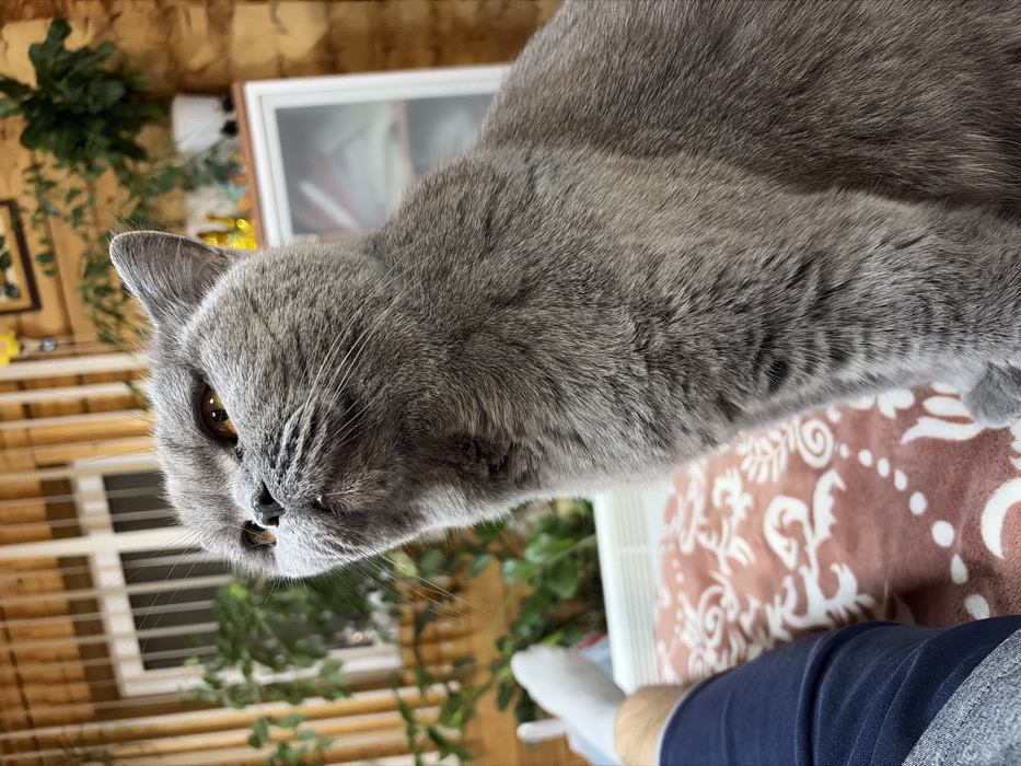 A gray British Shorthair cat is positioned in the upper center. The cat's face is angled downward. Visible are a portion of a person wearing blue pants and a gray sock in the lower right. A brown and white patterned blanket is beneath the cat. A window with blinds is in the background, and plants are visible near the window. Part of a white-framed picture or mirror is also visible in the background.