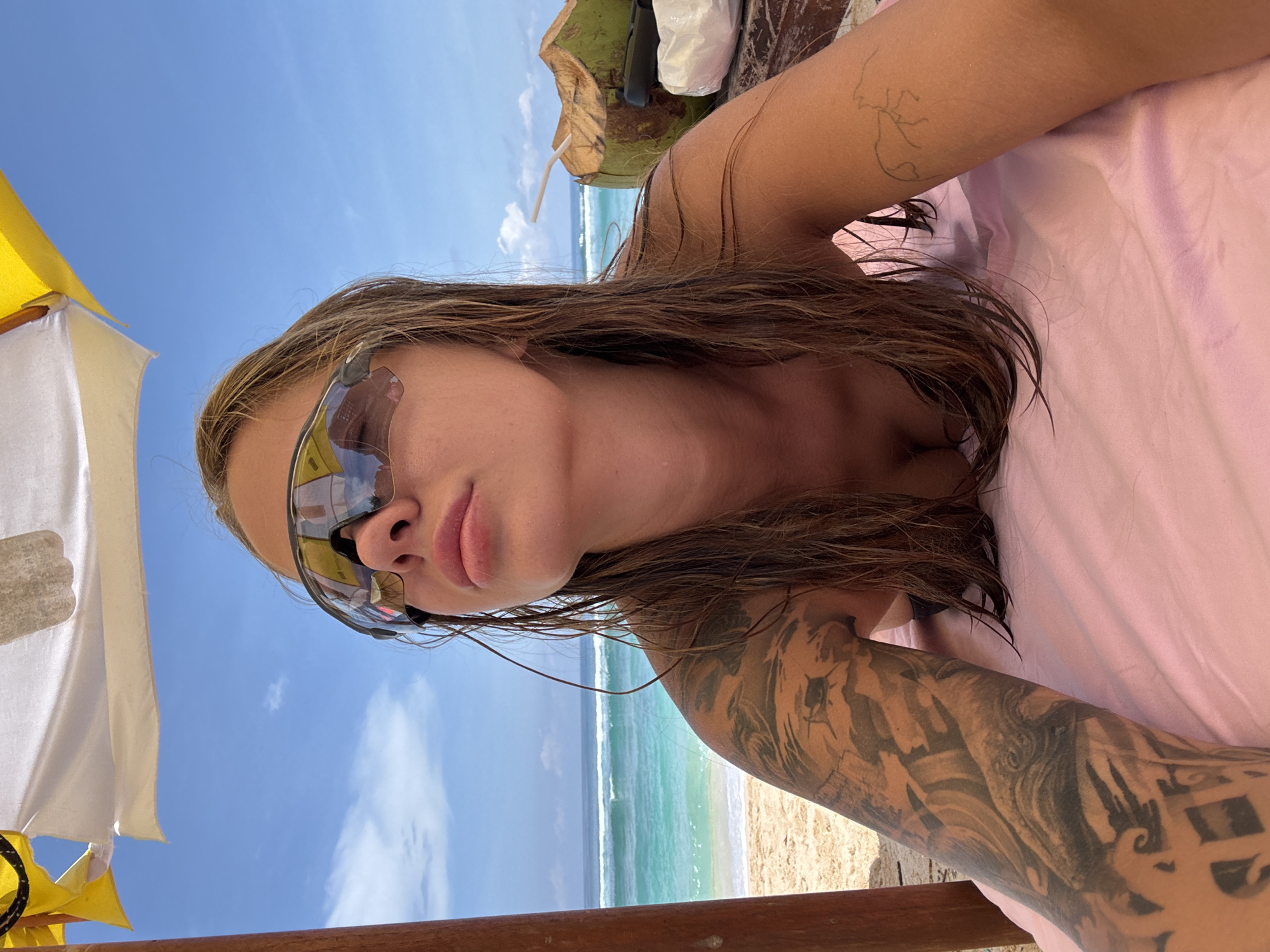 A woman with wet brown hair and sunglasses is at a beach in Kuta Selatan, Indonesia. She is wearing a pink top and has tattoos on her arms. A coconut with a straw is visible in the background. The beach has white sand and turquoise water under a blue sky with scattered clouds. A beach umbrella is partially visible on the left side of the frame.