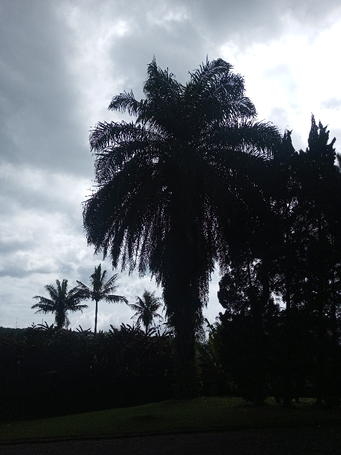 The scene depicts an outdoor environment in Sarwahi Mal, India, under a heavily overcast sky. A large, tall palm tree, completely silhouetted against the bright, cloudy backdrop, dominates the central and right portions of the midground, extending from near the bottom to the top of the frame. Its dense, downward-hanging fronds are clearly visible in silhouette. To the right of this palm, a cluster of dark, dense trees, exhibiting conical or broadleaf forms, is also visible in silhouette. In the left midground, several smaller palm trees are similarly silhouetted in the distance. Below these trees, a continuous band of dark, dense foliage forms a horizontal line across the lower midground. The immediate foreground features a strip of green lawn. At the very bottom of the image, a dark, level paved surface is visible. No individuals, animals, or human-made structures beyond the paved surface are present.