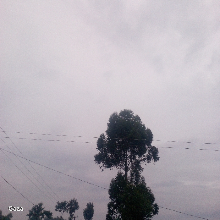 This image depicts an outdoor scene in Bonyamaro ward, Kenya, under an overcast sky. The upper two-thirds of the frame are dominated by a uniform, light grey sky with visible cloud cover. A large, dark green deciduous tree stands prominently in the center-right, extending from the lower edge towards the upper middle of the frame, with its foliage appearing dense. Multiple black electrical or utility lines traverse horizontally across the mid-ground, passing behind the main tree, with additional diagonal lines visible in the lower-left quadrant. Several smaller, dark green tree tops are visible in the lower-left foreground. The word "Gaza" is present as white text in the bottom left corner of the image. No people, animals, or specific actions are discernible.