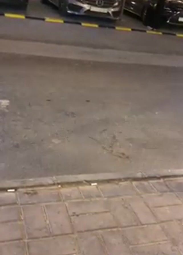 view from a low angle of a parking area at night. There are three parked cars visible, a dark one on the left, a silver Mercedes in the center, and a dark SUV on the right. A woman dressed in a black garment is standing next to the SUV. The ground in the foreground is made of grey, rectangular paving stones and the parking area is marked with yellow lines. The general lighting is dim.