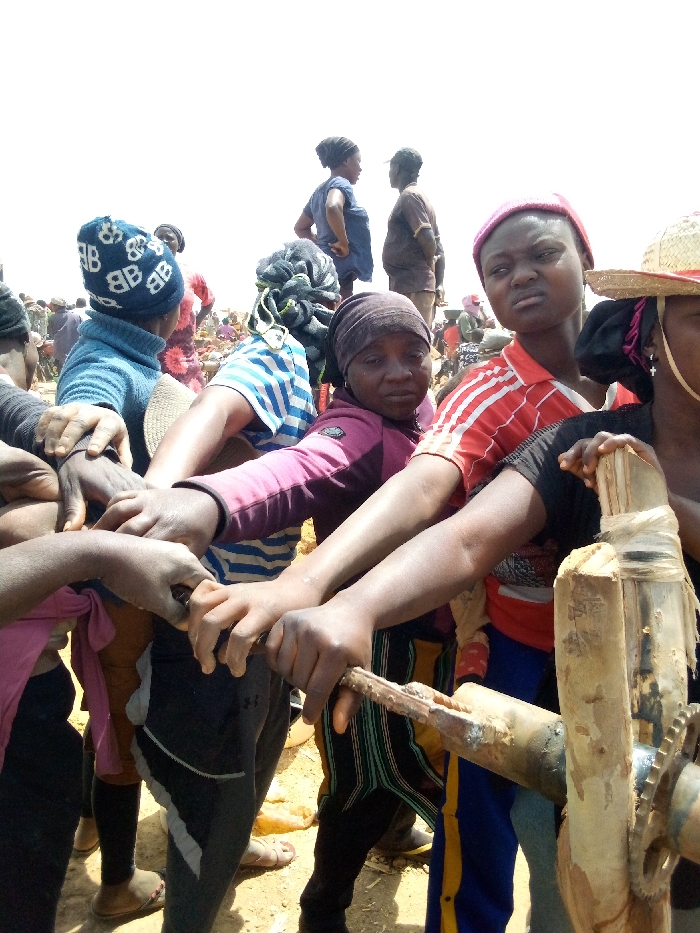 The image depicts a crowded outdoor scene in South Ropp, Nigeria, under bright daylight. In the foreground, approximately five to seven individuals, predominantly women, are engaged in a collective manual activity. Their hands are interlocked and gripping a weathered, cylindrical mechanism, possibly wooden, featuring an exposed gear and a handle, consistent with a hand pump or similar manual device. In the central foreground, a woman with a dark head covering and a maroon long-sleeved top looks directly at the camera with a neutral expression. To her right, another woman wearing a red and white striped top and a pink hat also looks directly at the camera with a slightly stern expression. Partially visible on the far right is an individual wearing a straw hat and a small cross earring. To the left, an individual is observed from the back, wearing a light blue sweater and a blue and white "BB" patterned beanie. Another individual wears a blue and white striped top and a patterned head covering. The ground beneath the subjects is dry and light-colored, indicative of dirt or sand. The background features numerous blurred figures, suggesting a densely populated area. Two figures stand prominently against a bright, overexposed sky, appearing to be in conversation.