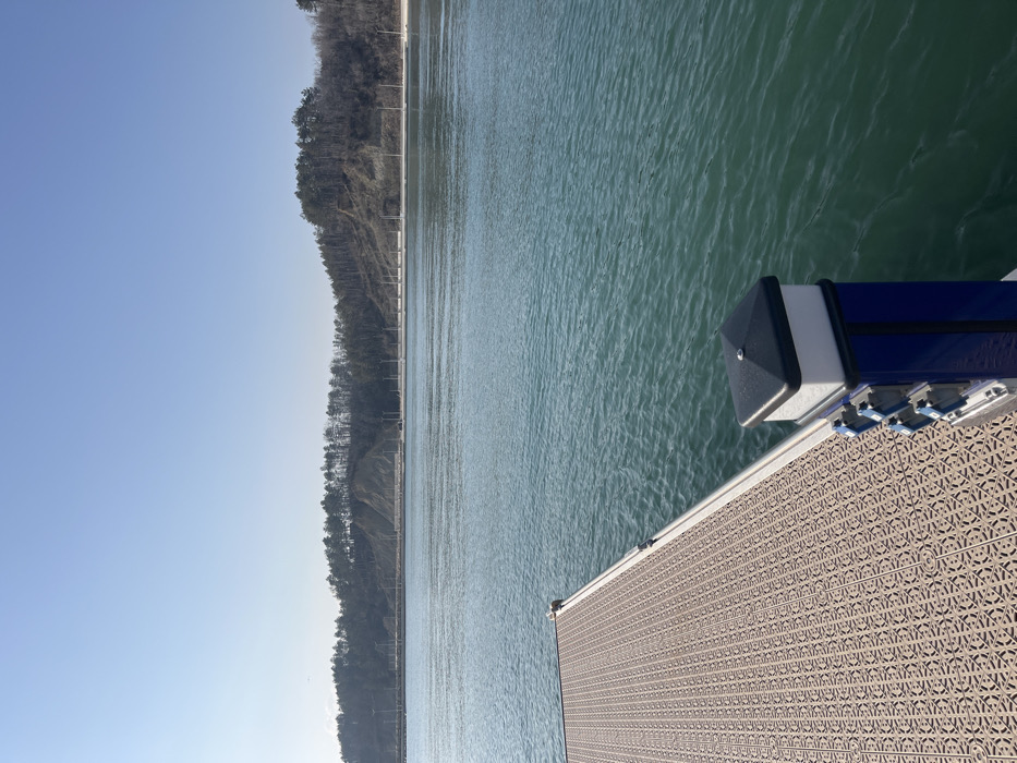 The image displays a coastal scene in Byala, Bulgaria, viewed from a floating dock on a clear, sunny day. In the foreground, the beige, geometrically textured surface of a dock extends from the lower left towards the mid-left. A dark blue utility pedestal with a white top and black cap is positioned in the lower right, featuring three silver-colored access points on its side. The mid-ground is dominated by calm, turquoise-green water with subtle ripples. The background features a sloping, forested coastline with primarily deciduous trees, suggesting a non-summer season. Below the tree line, a light-colored sandy or gravel beach is visible, bordered by a series of uniformly spaced light poles. Further left along the coast, a concrete or paved structure extends into the water. The sky above is clear and light blue. No individuals or active subjects are present.
