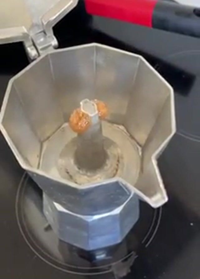 top portion of a Moka pot on a black electric cooktop. The Moka pot is made of dull grey metal and the lid is open. Inside the pot is a central metal spout with some brown staining. A small amount of dark brown coffee grounds are added to the inside of the Moka pot. To the upper right of the pot, slightly out of focus, is a red and black handled tool or object.