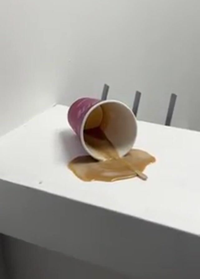 n overturned disposable coffee cup lying on its side on a white surface. The cup is mostly white with a maroon-colored band around the top. A brown liquid, presumably coffee, has spilled out of the cup onto the surface, forming a small puddle. A light brown wooden stir stick lies partially submerged in the coffee. The surface appears to be a shelf or countertop, with a white wall visible in the background. There are three vertical gray metal bars fixed to the back surface behind the cup. Sounds of human speech, apparently in Hebrew, are audible.