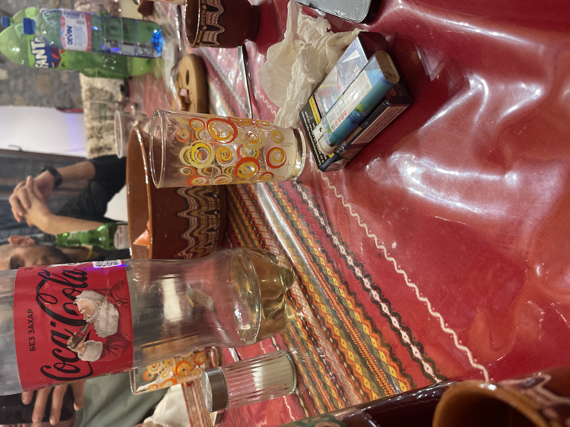 An indoor dining scene in Dragijevo, Bulgaria, is depicted from a slightly elevated perspective, focusing on a table set with food and beverages. The table is covered with a red tablecloth featuring traditional Bulgarian patterns in red, orange, yellow, black, and white, protected by a clear plastic sheet. In the foreground on the left, a portion of a brown ceramic cup with geometric patterns is visible. Moving right, a clear plastic Coca-Cola bottle, labeled 'БЕЗ ЗАХАР' (SUGAR FREE) and depicting Santa Claus, stands upright. Adjacent to it are a clear, ribbed glass salt shaker filled with white salt and a separate clear plastic bottle containing a light amber liquid, approximately one-quarter full. A clear glass, featuring orange and yellow concentric circle designs, is positioned further right. The mid-ground includes a brown ceramic bowl with a wavy pattern, containing orange-colored food items. Next to it, a pack of Sobranie cigarettes with a blue lighter on top rests beside a crumpled pile of white paper napkins and a partially visible smartphone with a cracked screen. In the background, blurred elements include a small wooden cutting board holding a piece of processed meat and a metal fork, a green Fanta bottle, and a blue plastic bottle of Devin mineral water. Two individuals are partially visible: one's right hand is near the Coca-Cola bottle, while another's clasped hands, wearing a dark long-sleeved shirt and a watch, are visible across the table. The room's background features a stone wall and a section of a white wall, suggesting a rustic interior setting. The scene portrays a relaxed social gathering around a meal.