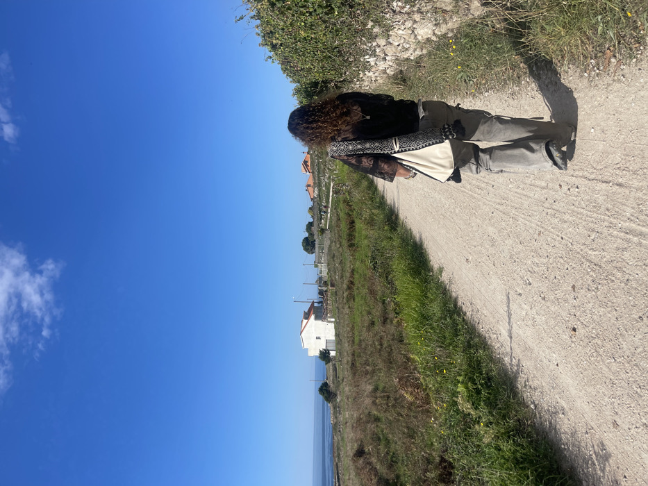 A person is depicted from behind, walking away from the viewer on an unpaved dirt path under a clear blue sky with a single white cloud. The individual has long, curly brown hair and is wearing a black, lace-patterned long-sleeved top over a white garment, grey cargo pants, and dark athletic shoes. A cream-colored tote bag is slung over their left shoulder, containing a black and white patterned rolled item, possibly a mat or blanket. To the left of the path, an uncultivated field of green and brown vegetation, including small yellow flowers, extends towards the horizon. In the mid-ground on the left, a white two-story house with a red-tiled roof stands, with the calm blue sea visible beyond it. Utility poles and lines are present in this area. To the right of the path, a low stone wall is partially covered by dense green foliage. Further down the path on the right, additional red-roofed buildings are visible on a slight rise. The scene is located in a coastal, rural area near Vilar, Spain, characterized by natural vegetation and residential structures.