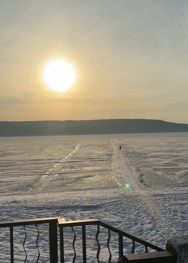 person walking across a frozen lake under a bright sun. The sun is low in the sky, creating a warm, golden glow. The lake is covered in ice and snow, with visible tracks that suggest previous travel. A line of trees is visible in the distance, forming a dark silhouette against the horizon. A dark metal railing is visible in the foreground of the shot.