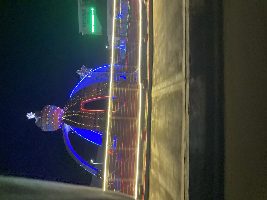 - "A nighttime scene shows a tall, lit structure resembling a Christmas ornament with a star on top" by FM-BJ0iM2, licensed under CC BY 4.0