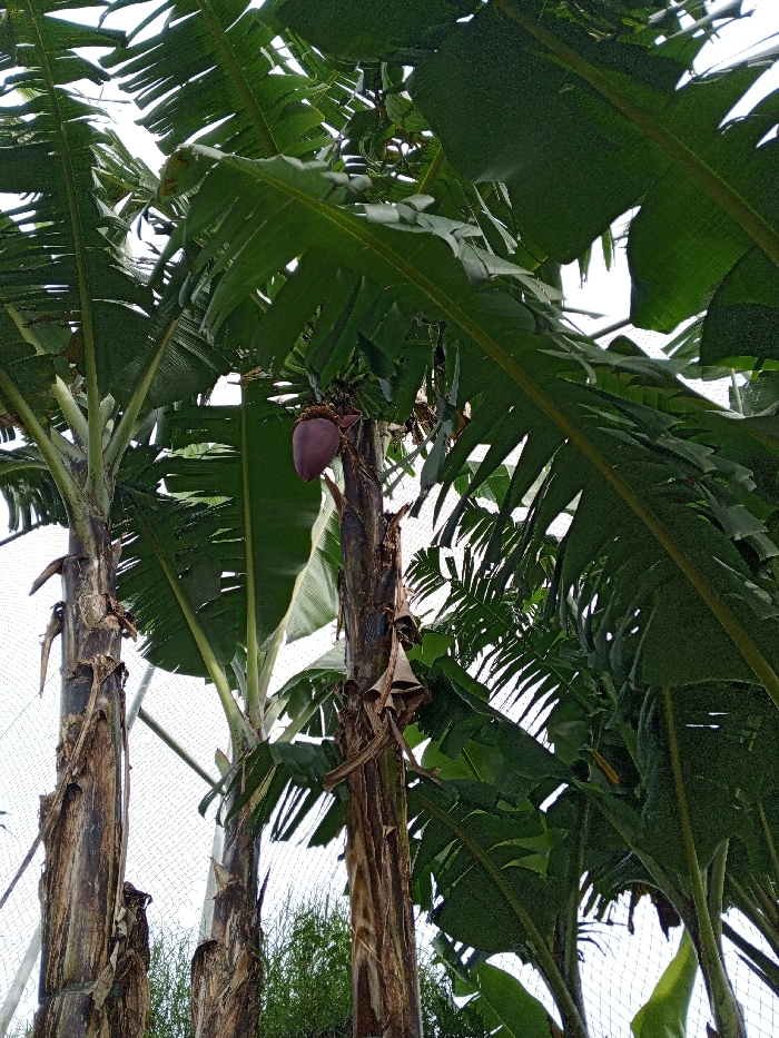 A close-up showcases a cluster of banana plants. Their tall, textured trunks support large, vibrant green leaves reaching towards the sky. A prominent purple banana flower hangs from one plant, hinting at future fruit. In the background, a mesh net is partially visible, and a patch of greenery peeks from below. The composition captures the tropical and lush nature of the banana grove.