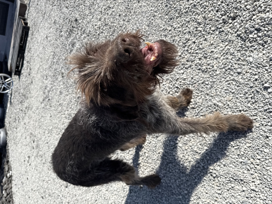 - "A medium-sized, wire-haired dog stands on a light gray gravel surface under direct sunlight" by FM-8U6k03, licensed under CC BY 4.0