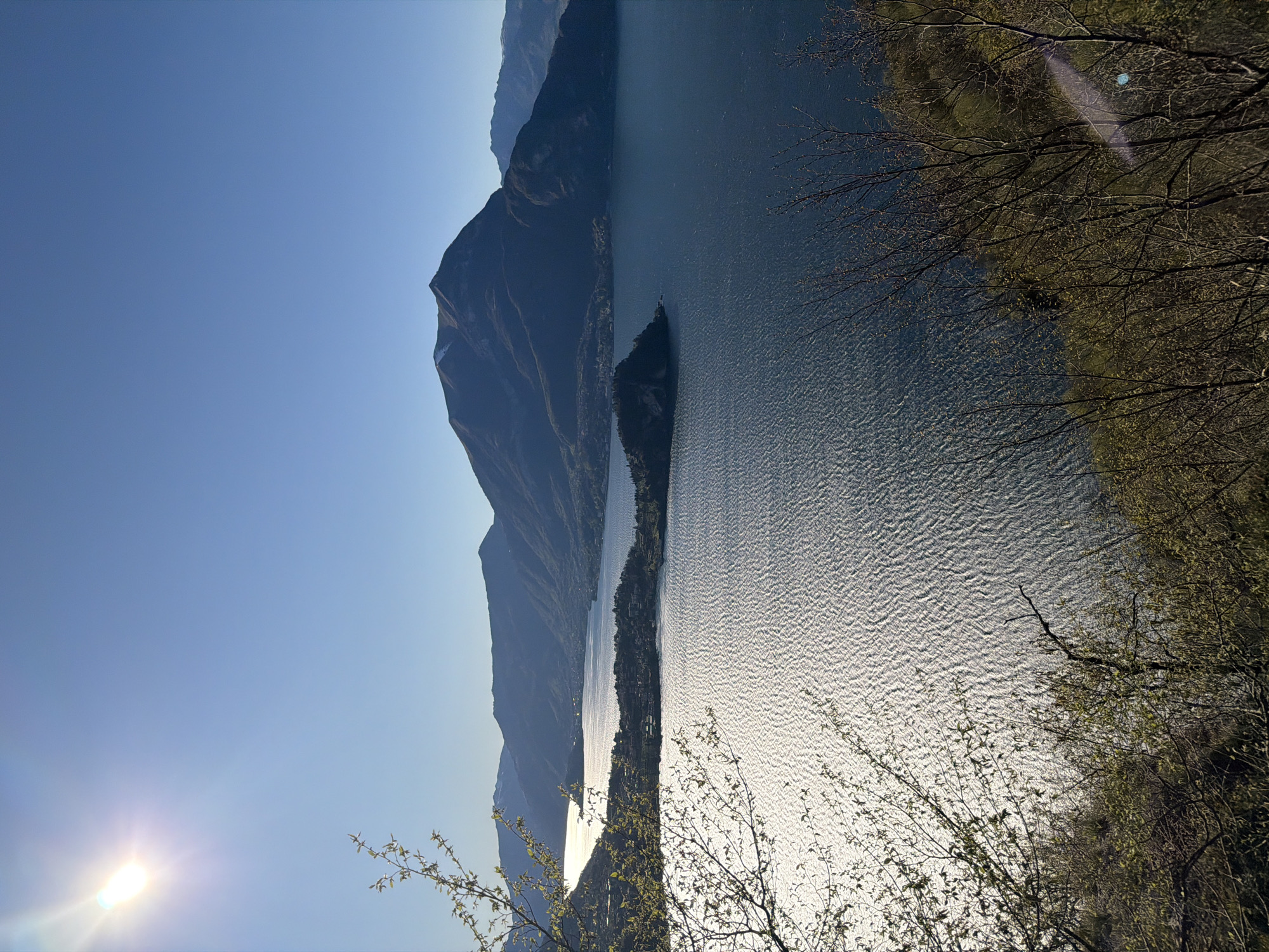 The image presents a landscape scene featuring a body of water surrounded by mountains, likely a lake in the Pino, Italy area. The water surface reflects sunlight, creating a shimmering effect. Mountains rise prominently on the left side of the image. Trees with budding leaves are visible in the foreground, partially obscuring the view. The sky is clear and blue with the sun shining brightly on the bottom left.