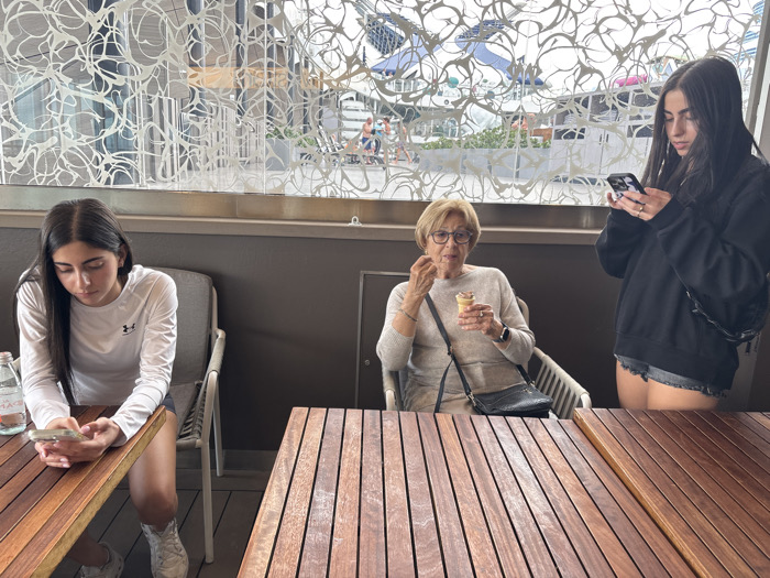 Three individuals are depicted on an outdoor patio or balcony in the City of Berry Islands, Bahamas. On the left, a young female with long dark hair, wearing a white long-sleeved Under Armour shirt and dark shorts, sits at a slatted wooden table, gazing at a smartphone held in both hands. A clear plastic water bottle is on the table beside her. Centrally, an elderly female with short light hair and eyeglasses, dressed in a light-colored long-sleeved top and a dark cross-body bag, is seated and consuming a chocolate-swirl ice cream cone with a spoon. To the right, a second young female with long dark hair, wearing a black long-sleeved hoodie and dark denim shorts, stands and focuses on a smartphone held in both hands. The background reveals a large window featuring an intricate white abstract screen, through which a blurred view of a waterfront area with distant boats and figures is visible.
