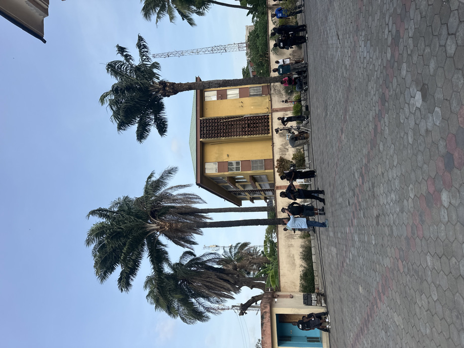 The image displays an outdoor production scene in Lagos, Nigeria. The precise street location is not identifiable from the visual information. The foreground consists of a paved surface made of interlocking hexagonal bricks patterned in shades of grey, red, and dark grey. The scene is dominated by several tall, mature palm trees under a clear, light blue sky. In the background, a multi-story building, appearing to be at least three floors, is painted yellow with a green hip roof. This building features multiple windows and a distinctive brown geometric patterned facade element on its right side. To the far left, a smaller, light blue structure with a lighter-colored roof is visible. A low, off-white concrete wall runs horizontally, separating the paved area from the yellow building and behind it, lush green foliage. Further in the background, behind the yellow building and palm trees, a tall, metallic lattice communication tower is visible. Approximately 15-20 individuals are present, predominantly in the mid-ground. Most are dressed in casual clothing. On the left, near the light blue building, a few individuals are standing, and one is seated. A central group of approximately 5-6 men appear to be engaged in conversation or instruction; one man in a light blue collared shirt is prominent within this group. Further to the right, several individuals are positioned around professional film equipment, including at least two cameras on tripods and associated lighting stands, indicating a film or video production is underway.