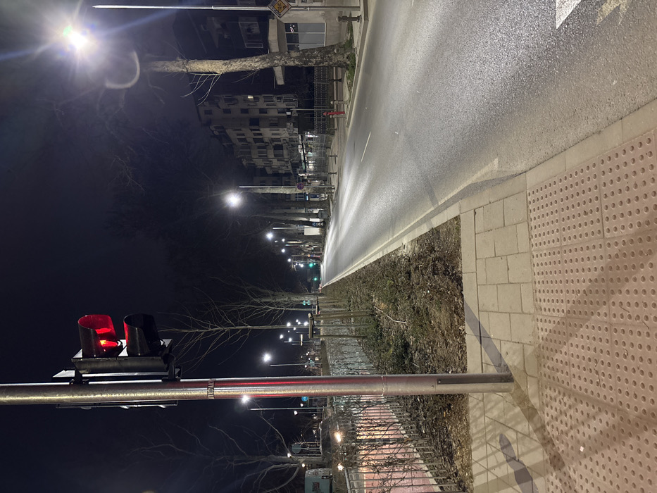 The image depicts a nighttime scene on a prominent street in Plovdiv, Bulgaria. The perspective is from a sidewalk, looking down a straight, well-lit asphalt road. In the immediate foreground on the left, a tall, metallic pole supports a vertically oriented traffic light with a single red light illuminated, indicating a stop signal. The sidewalk beneath the pole is composed of light-colored square pavers, transitioning into a section of reddish-brown tactile paving with raised circular studs. A distinct shadow from the pole extends onto the sidewalk. To the right of the pole, a narrow strip of dark, bare earth with sparse vegetation and small, leafless saplings acts as a median, separating the sidewalk from the main road. Further left, beyond a metal barrier fence, a distinct red-painted lane is visible, possibly a dedicated bicycle or bus lane, with faint reflections of streetlights. The main thoroughfare consists of at least two lanes of asphalt road in the visible direction, illuminated by numerous modern LED streetlights mounted on tall poles lining both sides of the street. The road surface is clear of vehicles in the immediate vicinity but shows reflective patches from the artificial lighting. White road markings are visible near the right edge of the road, including a partial arrow pointing forward. On the right side of the street, another sidewalk runs parallel to the road. Behind it, a line of mature, bare-branched trees stands in front of multi-story buildings, typical of residential or mixed-use urban architecture, with some windows showing interior illumination. Street furniture on the right sidewalk includes a red fire hydrant and several bollards. In the distance, other traffic lights are faintly visible, with one showing a green light. The night sky above is dark and clear, with no visible precipitation or cloud cover. No people or active interactions are visible in the scene.