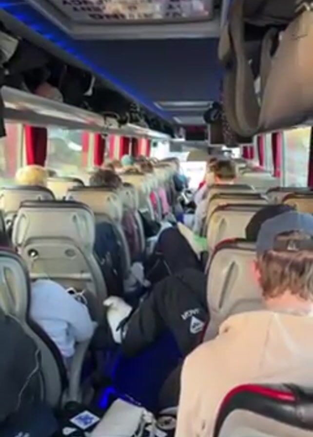 The inside of a bus filled with passengers is captured in this static, eye-level shot