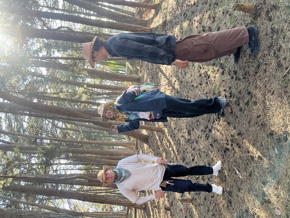 Three individuals are observed standing in a forested area in Škaljari, Montenegro. The ground is covered with a dense layer of dried pine needles and numerous pine cones. Tall, slender conifer trees with straight, brown trunks form a dense background, with sunlight filtering through from the upper right, creating lens flares and distinct shadows on the ground. From left to right: 1. A male subject, with a shaved head or very short hair, visible tattoos on his neck and forearms, is wearing a tan cowboy hat, a light-colored long-sleeve shirt, a light-colored bandana around his neck, dark pants, and white athletic shoes. A set of keys is attached to his right hip. He stands with hands on his hips, facing slightly right of the camera. 2. A subject with long, yellow/blonde braided hair (possibly dreadlocks) is wearing a tan cowboy hat, a dark blue or black jacket over a light-colored t-shirt with a colorful graphic print, dark loose-fitting pants, and dark shoes. A light-colored backpack with green straps is worn on the back, and a blue fanny pack is visible around the waist. The subject holds a small, dark object in the raised left hand, gesturing towards the right subject. 3. A male subject is wearing a tan cowboy hat, a dark plaid long-sleeve shirt, dark brown cargo pants, and dark athletic shoes. A watch is visible on his left wrist. He is turned towards the center subject, appearing to be in conversation or listening. The center and right subjects are positioned to interact, while the left subject stands adjacent to the group. A light-colored vehicle is partially visible through the trees in the distant left background.