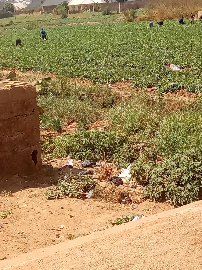 This image depicts an outdoor agricultural scene in Barikin Jirga Summa, Nigeria. In the foreground, a partially visible, reddish-brown brick structure with a dark opening stands on dry, light brown earth. Adjacent to this structure and extending into the midground, the terrain is characterized by unkempt patches of green vegetation, including taller grasses and shorter plants, interspersed with dry weeds. Numerous pieces of litter, primarily white and black plastic bags, are scattered across the ground among the vegetation in this area. The background features a large, expansive field of densely cultivated green leafy crops, likely cabbage, extending horizontally. Approximately five to seven individuals are visible within this field, bent over and appearing to be engaged in farming activities. One individual in a blue shirt is discernible in the left-center, and another in dark clothing is near the left edge, both stooping. In the far distance beyond the field, several buildings with light-colored roofs and trees are visible, indicating a nearby settlement. The scene is illuminated by natural daylight.