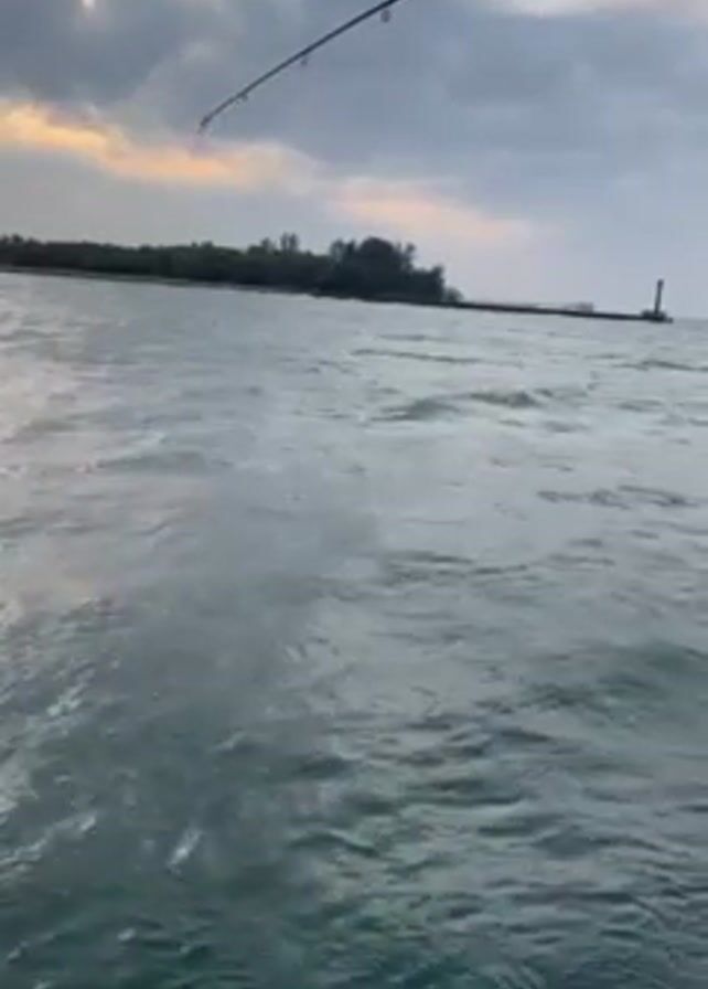 view from a boat with a fishing rod pointing out over the water. The water is choppy, and there is an island with a lighthouse visible in the distance under an overcast sky. The boat appears to be moving through the water, creating waves.