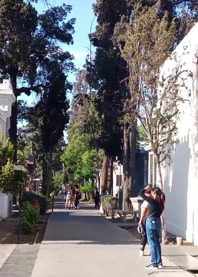 pathway inside a cemetery lined by tall, green trees and white walls. A group of people is walking down the pathway, away from the camera. Two women are standing near the edge of the pathway, on the right, looking towards the group. One of the women is holding her head. The sky is blue and clear.