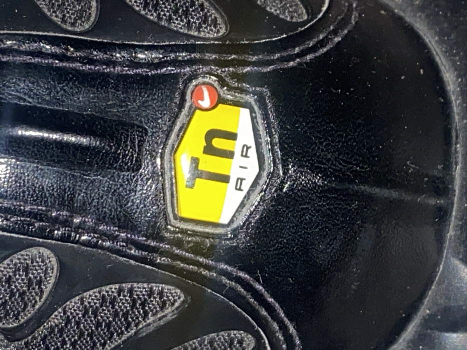 A close-up shot reveals a portion of a black athletic shoe. The shoe features a textured sole and a smooth, possibly leather-like, upper. A hexagonal logo with a yellow background and white "tn AIR" lettering is prominently displayed. A small red Nike swoosh is positioned above the logo. The image highlights the details of the shoe's design and branding.