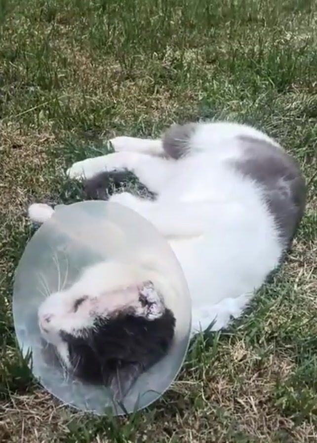 - "A white and gray cat wearing a plastic cone collar lies on its side in green grass" by FM-E8rQG2, licensed under CC BY 4.0