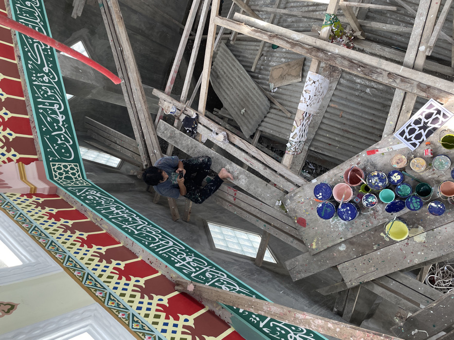 An overhead view captures a scene within a building under construction or renovation in Kumbang, Indonesia. A barefoot male, appearing to be a young adult, is seated cross-legged on a wooden plank forming part of a multi-tiered scaffolding structure. He wears a grey t-shirt and dark pants heavily splattered with paint, and is actively engaging with a smartphone held in both hands. The upper walls of the structure are adorned with intricate Islamic calligraphy in white on a teal green band, bordered by geometric patterns in red, yellow, and dark pink. Below the individual, numerous open containers of paint in various colors, including blue, green, red, yellow, and pink, are arranged on a paint-splattered wooden surface, alongside a stencil featuring an Islamic geometric star pattern. Other fragmented stencils are visible on adjacent planks. The scaffolding is constructed from rough wooden planks and beams. Below the scaffolding, corrugated metal sheets and bare concrete walls with glass block windows are visible. A red pipe or hose descends into the scene from the upper right.