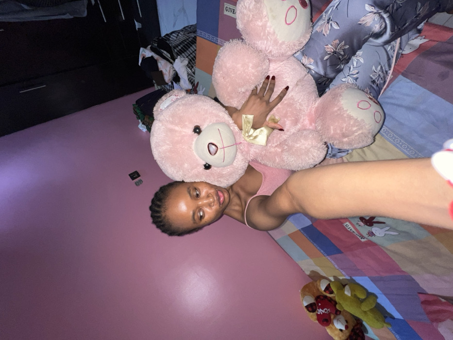 A young woman with dark braided hair lies on a colorful, patterned bed with a large pink teddy bear. She wears a light pink tank top and floral pajama pants. Her hand rests on the bear, displaying red nail polish. A collection of plush toys sits at the foot of the bed. The room has pink walls and a dark wardrobe is visible in the background. Two small black SD cards are on the floor.