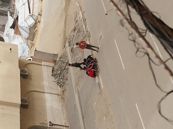 An aerial perspective captures a street scene in Khan Yunis, Palestinian Territory. The paved road features two parallel white lane markings. On the left, a concrete curb separates the road from a light-colored sidewalk. Five children are seated along this curb, some wearing red tops. A sixth child, wearing a red top and dark pants, stands on the road, facing the seated group. A seventh child, dressed in dark clothing, walks on the sidewalk, positioned next to a substantial pile of concrete and soil debris. The lower section of a light-colored building, featuring a stone veneer base and two external air conditioning units, is visible on the far left. In the upper right background, multiple white tarpaulin tents are visible on sandy, unpaved terrain, indicating an informal settlement. The immediate foreground contains out-of-focus bundles of dark wires with interspersed colored segments.