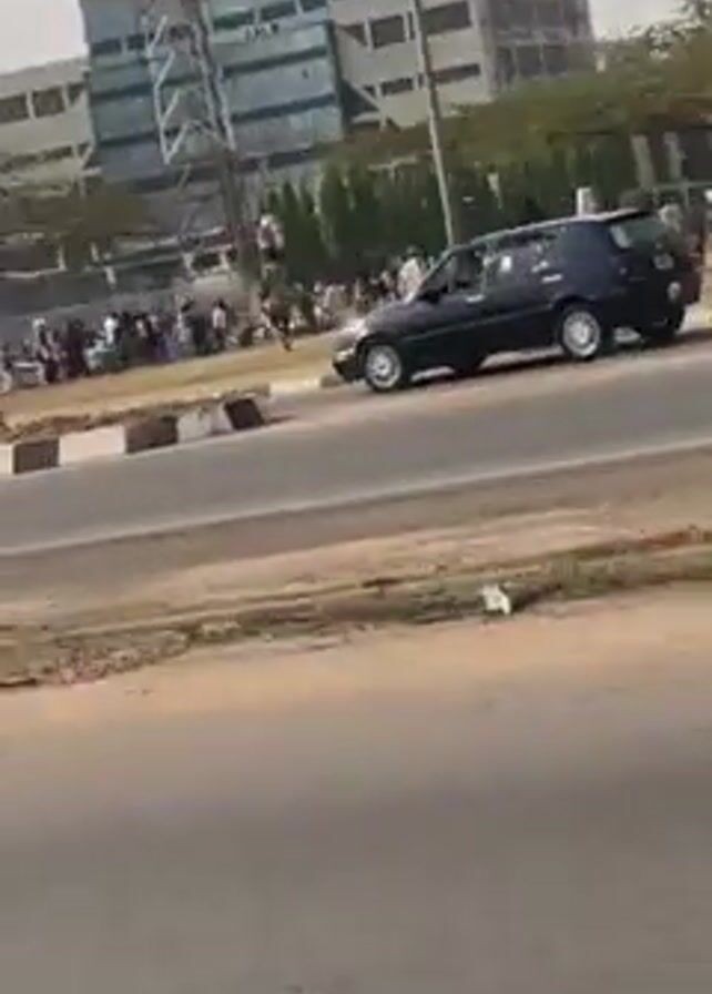 view from a moving vehicle, looking out at a roadside scene. Along the road, there are several groups of people gathered, some at a bus stop. Various vehicles pass by on the road, including cars, and what appears to be a motorcycle. In the background, there are buildings, including one with "ACC" visible on its side. There are also utility poles and a billboard. The sky is overcast.