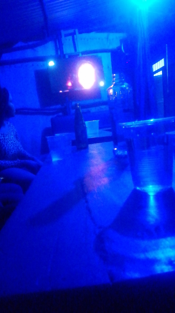 A dimly lit, blue-toned interior features a table with a glass, a beer bottle, and a larger bottle behind it. The background shows a TV screen and what appears to be a window. The atmosphere is reminiscent of a bar or lounge setting. A person sits partially visible on the left, wearing an animal-print garment.