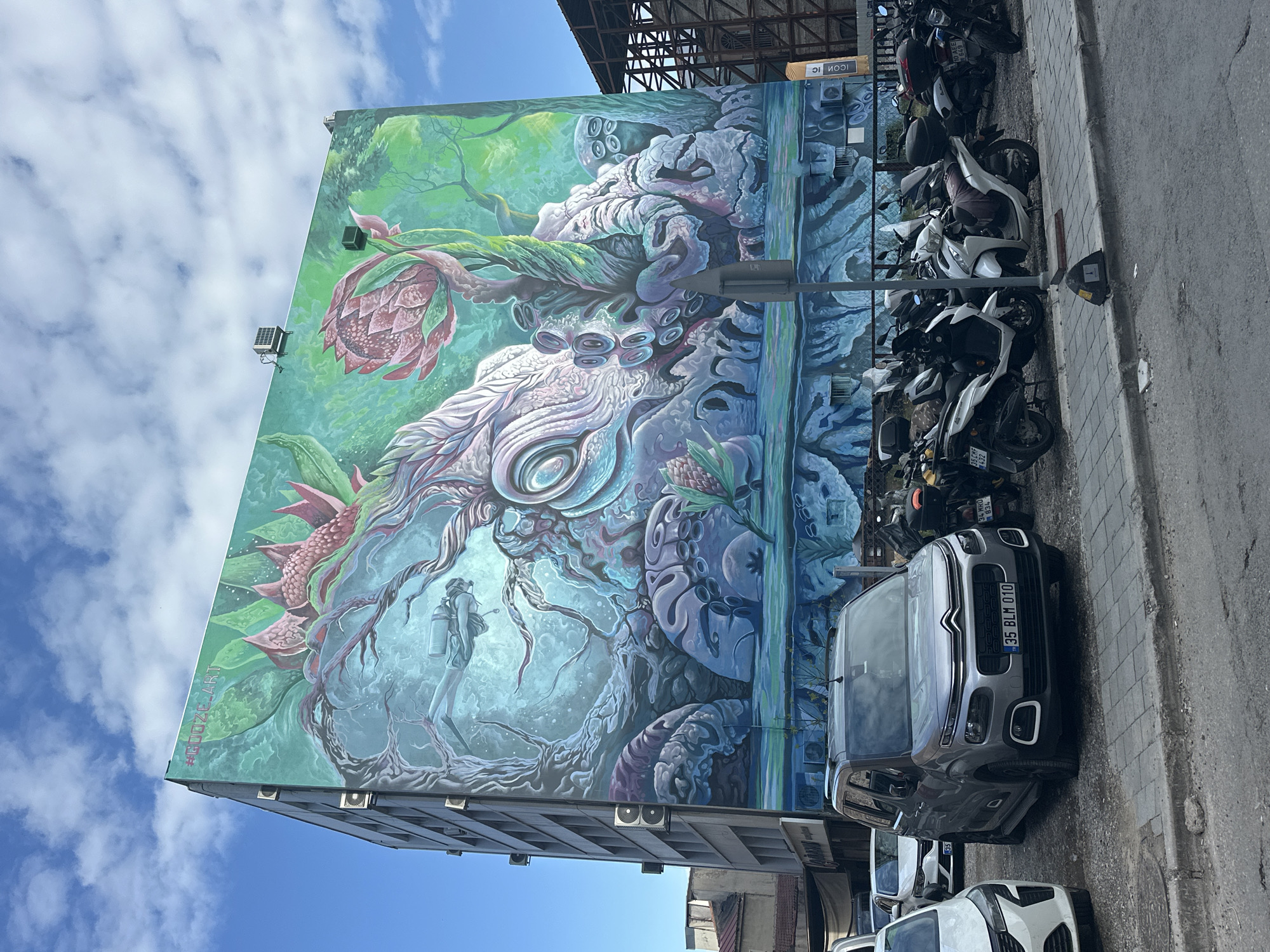 The image showcases a large mural painted on the side of a building in İzmir, Turkey. The mural depicts an underwater scene with a diver, large floral elements, and an octopus-like creature. The artwork covers a substantial portion of the building's exterior, reaching towards a blue sky with scattered clouds. Below the mural, the scene transitions to a city street. Several parked vehicles are visible, including a gray Citroën car with the license plate "35 BLM 010" and numerous motorcycles. The street appears to be paved with worn asphalt and lined with a narrow sidewalk. The overall impression is a blend of urban art and daily city life.
