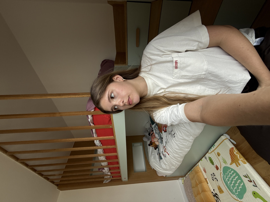 young woman sitting on a brown rug in a room in Antony, France. She is wearing a white t-shirt with the word “CHERRY” printed on the left chest pocket. The woman's right arm is extended towards the camera, while her left arm rests on her lap. She has long brown hair and is looking to the left, out of frame. The image is captured from a low angle, so the woman appears tall. Behind the woman is a bunk bed with a white mattress and a light blue headboard. The top bunk has a red mattress and a wooden headboard. The top bunk is framed by a wooden railing with vertical slats. Below the bed is a light blue dresser with two drawers. The scene is lit by natural light.