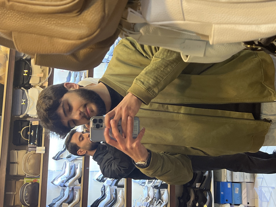 A young adult male, with dark, medium-length hair and a beard, is depicted taking a mirror selfie inside what appears to be a retail store in Al-Midan Municipality, Syria. He wears an olive green bomber jacket over a dark shirt and light-colored jeans, with a silver-toned watch on his left wrist. He holds a grey smartphone with multiple camera lenses in both hands, positioned to capture his reflection. In the background, also reflected in the mirror, another male with dark hair and a short beard, wearing a dark top, stands partially visible behind the primary subject's reflection. The store environment features multiple display shelves. The upper shelves hold various handbags and purses in colors such as beige, black, white, and blue, some with prominent gold-toned hardware and visible price tags. The middle shelves on the left display numerous pairs of women's high-heeled shoes, predominantly in light shades like white, silver, and beige, alongside some black pairs. The lower sections show additional footwear, including black flats, and stacked shoe boxes, some bearing the Adidas brand. Bright artificial lighting illuminates the merchandise throughout the scene.