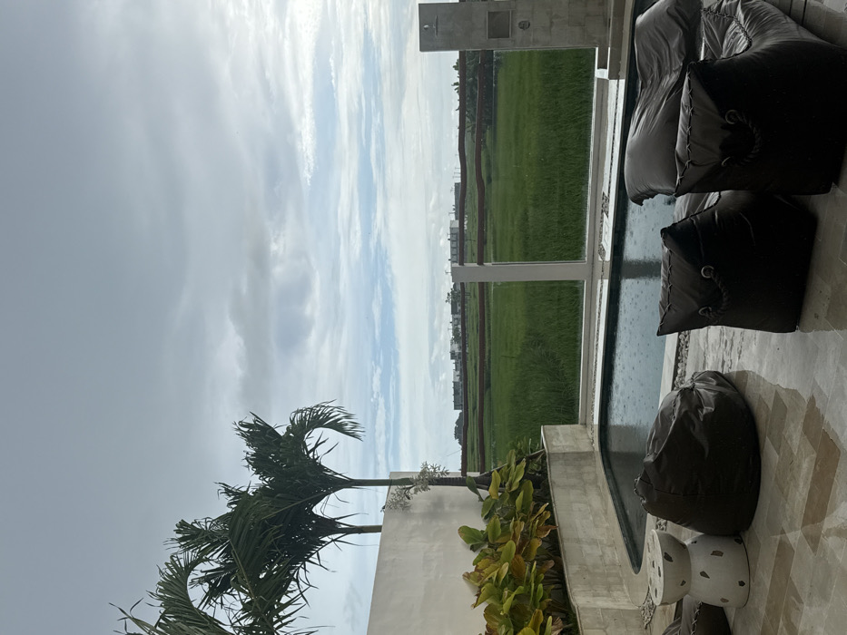 The image displays an outdoor or semi-outdoor poolside area in Unknown, Indonesia, experiencing rainfall under an overcast sky. In the immediate foreground, a wet, reflective tiled patio features four dark, presumably weather-resistant, beanbag-style lounge chairs; three are fully visible, two with rope-like handles. A white cylindrical side table with dark flecks is positioned among the seating. A rectangular swimming pool with dark water occupies the central midground, its surface visibly disturbed by raindrops. The pool is bordered by light-colored coping, with a raised planter containing green and reddish-brown foliage on its left edge. A light-colored pillar on the right side of the pool incorporates an outdoor shower fixture. Beyond the pool, a clear barrier with a white frame provides an unobstructed view of an expansive, vibrant green field, consistent with agricultural land, possibly rice paddies. Horizontal wooden or bamboo structures are visible within this field. In the distant background, a row of multi-story buildings with light facades and dark roofs is present beneath a predominantly grey, cloudy sky. Two tall palm trees are visible on the left, behind a white wall that borders the pool area. No individuals are present.