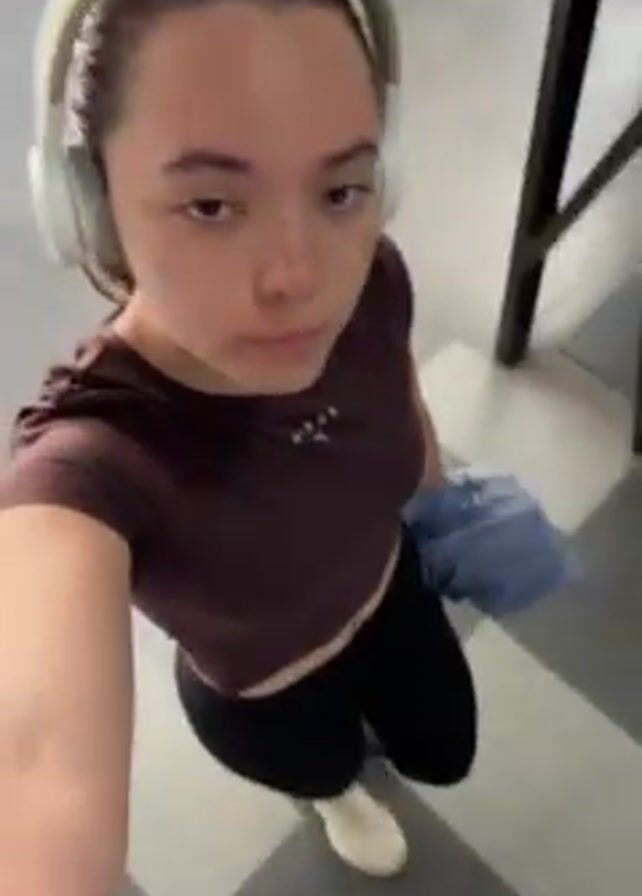 young woman in workout attire walking, presumably in a building, and taking a selfie video. She is wearing headphones, a dark brown cropped t-shirt, black leggings, and white sneakers. She is carrying something blue in her left hand. The floor has a geometric pattern. The lighting is bright. The video is shaky due to the camera moving.