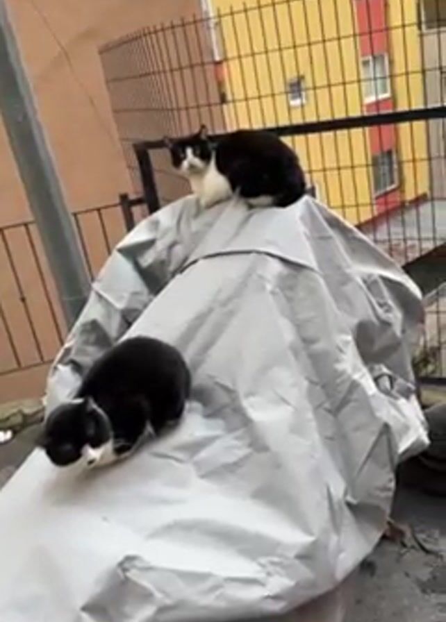 three cats in an outdoor setting. Two of the cats are black and white and are resting on top of a grey tarp covering an object. The third cat is grey and is curled up on a wooden plank next to the tarp. Behind the cats is a fence, and beyond the fence is a yellow building with multiple windows. The ground surrounding the cats appears to be pavement with some debris. An indistinct male voice speaks briefly in a foreign language. The camera slowly pans from left to right, focusing on each cat in turn.