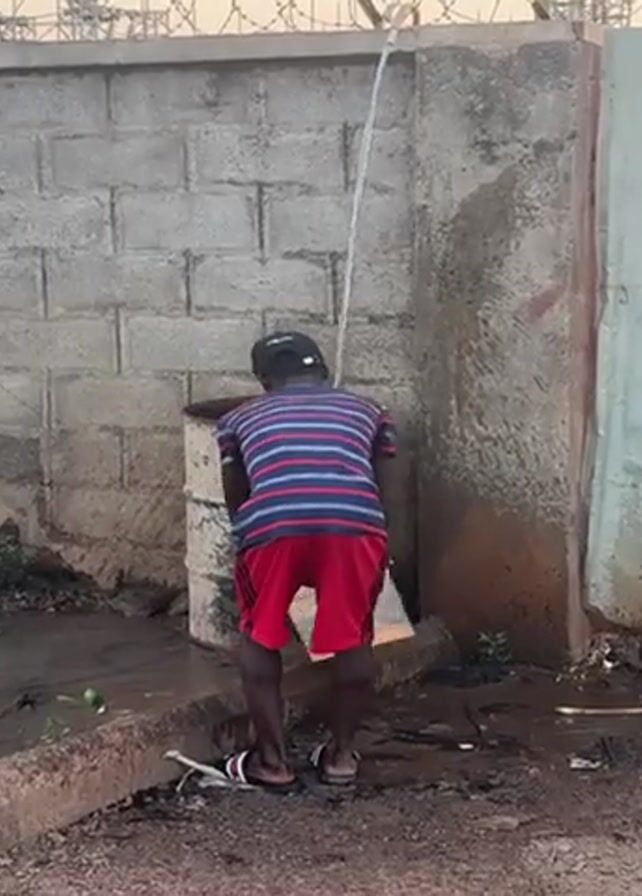 man filling a bucket with water from a pipe. He is wearing a striped shirt, red shorts, and sandals, and a baseball cap. He places the bucket under the pipe, and when it's full, he moves it. The area around the pipe is wet and muddy. There is a brick wall behind him and a fence with barbed wire on top. A metal barrel stands next to the wall.